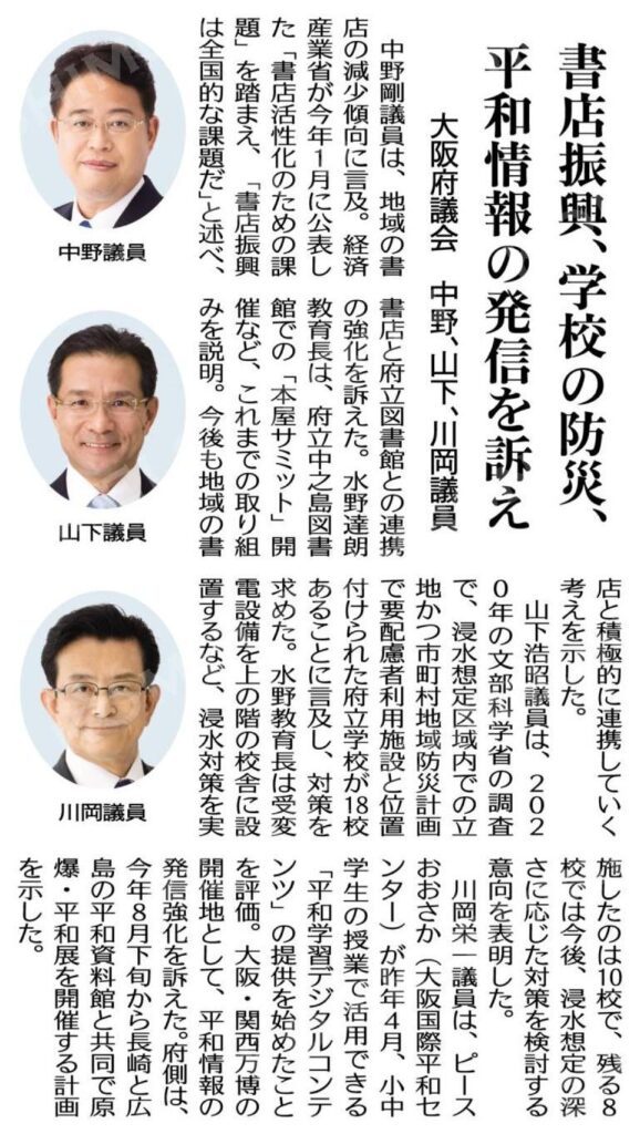 公明党大阪府議会議員団の一般質問の要旨が本日の公明新聞に掲載されました!