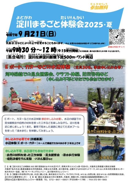この催しは「淀川まるごと体験会実行委員会」を中心に、大学や高校の生徒さん、地域団体、NPOなど多くの皆さまの協力で運営され、国土交通省淀川河川事務所・大阪府・寝屋川市も支援しています。