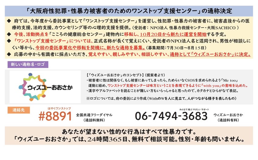 本日、「大阪府性犯罪・性暴力被害者のためのワンストップ支援センター(ウィズユーおおさか)」を視察しました。