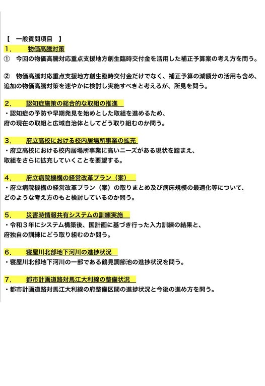 今回は、最重要課題である物価高騰対策をはじめ7項目 について質問します。